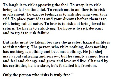 “To laugh is to risk appearing the fool. To weep is to risk being called sentimental. To reach out to another is to risk involvement. To expose feelings is to risk showing your true self. To place your ideas and your dreams before them is to risk being called naive. To love is to risk not being loved in return. To live is to risk dying. To hope is to risk despair, and to try is to risk failure.