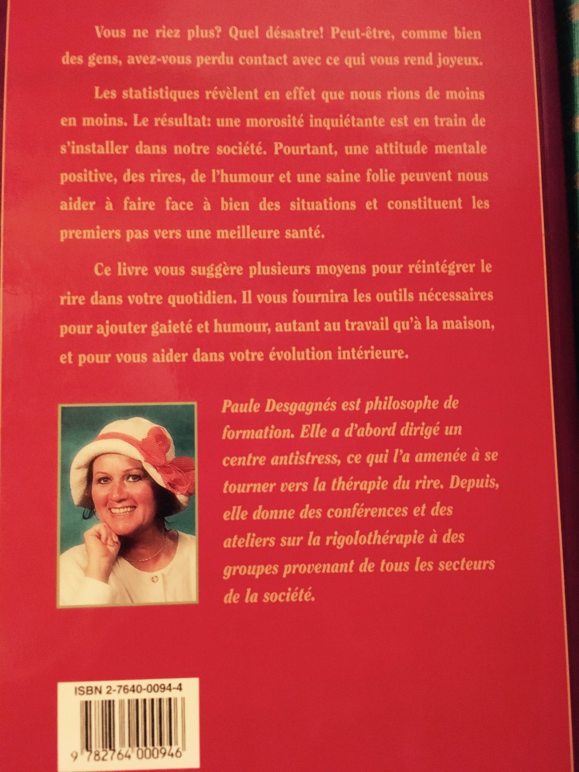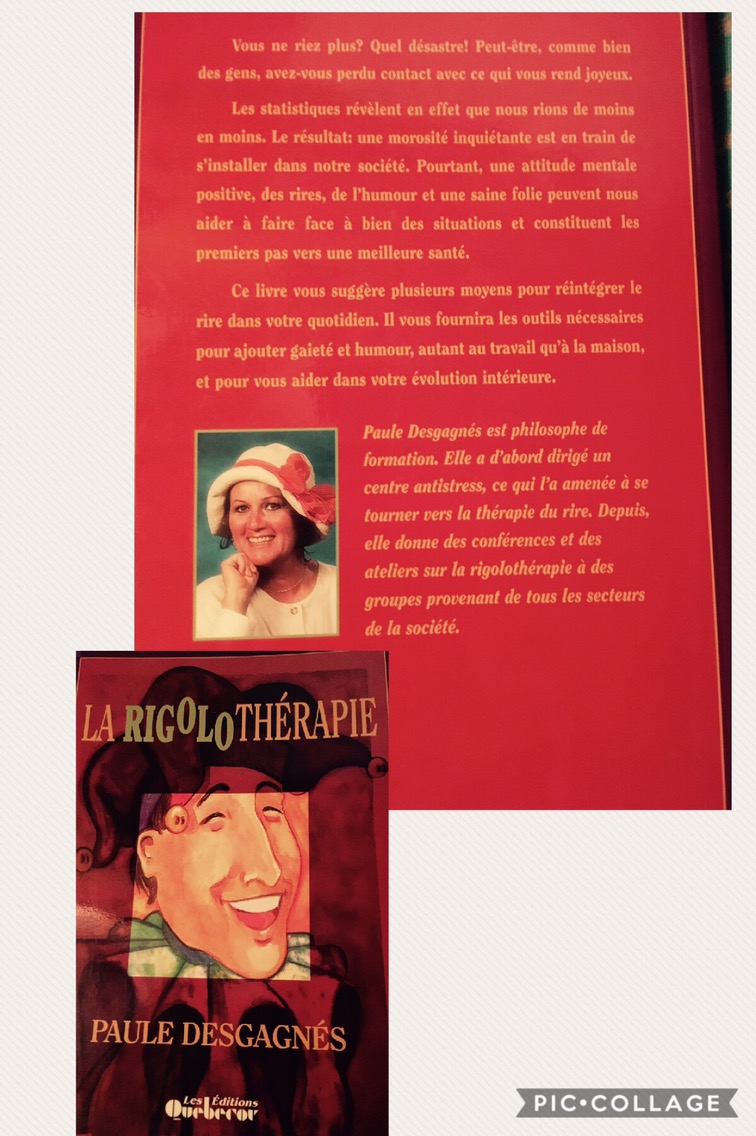 Voici sa bio: Paule Desgagnés est philosophe de formation. Elle a d’abord dirigé un centre antistress, ce qui l’a amenée à se tourner vers la thérapie du rire. Depuis, elle donne des conférences et des ateliers sur la rigolothérapie à des groupes provenant de tous les secteurs de la société.