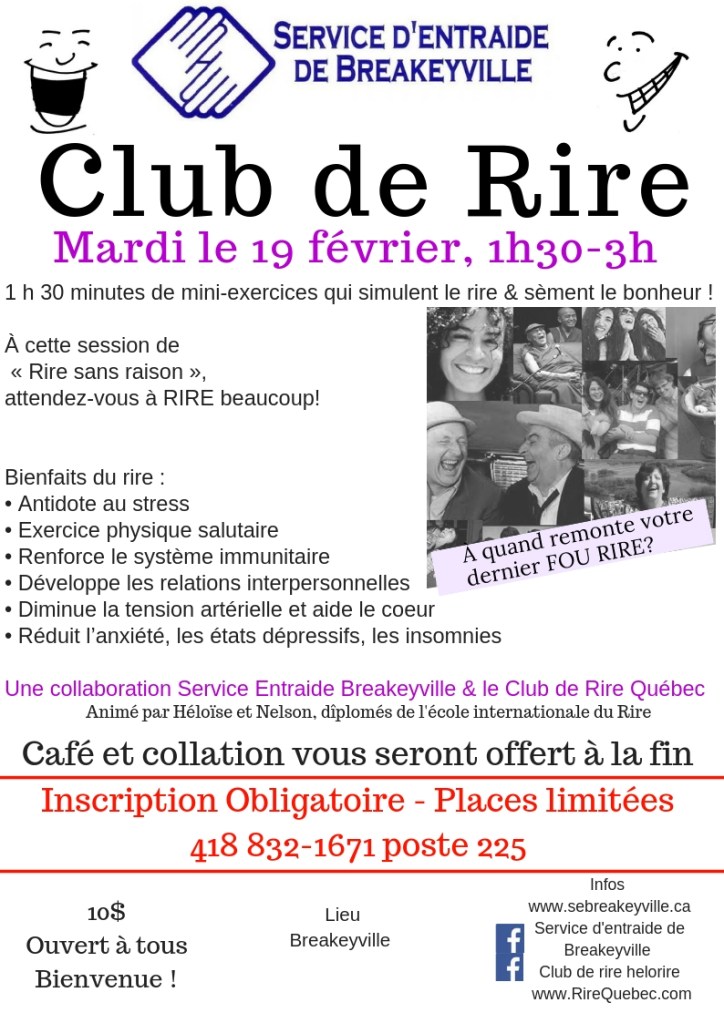 Bienvenu à tous!!10$ Inscription Obligatoire – Places limitées 418 832-1671 poste 225